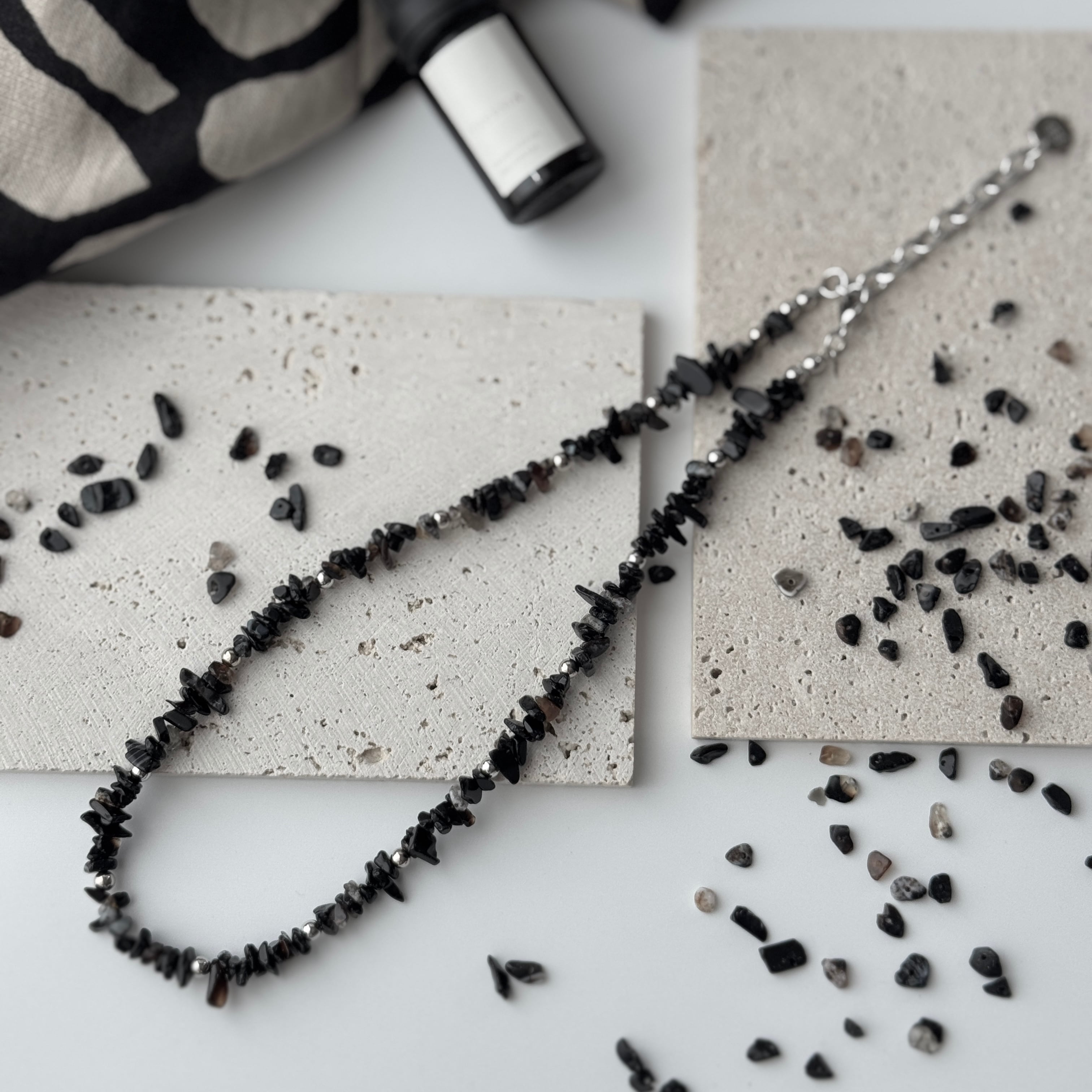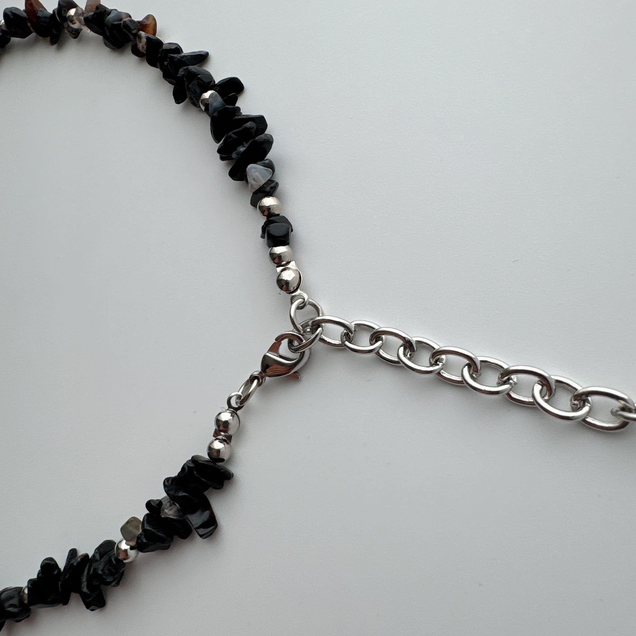 石の間にはシルバービーズを挟み込み、艶やかなブラックに輝きをスパイスのようにプラス