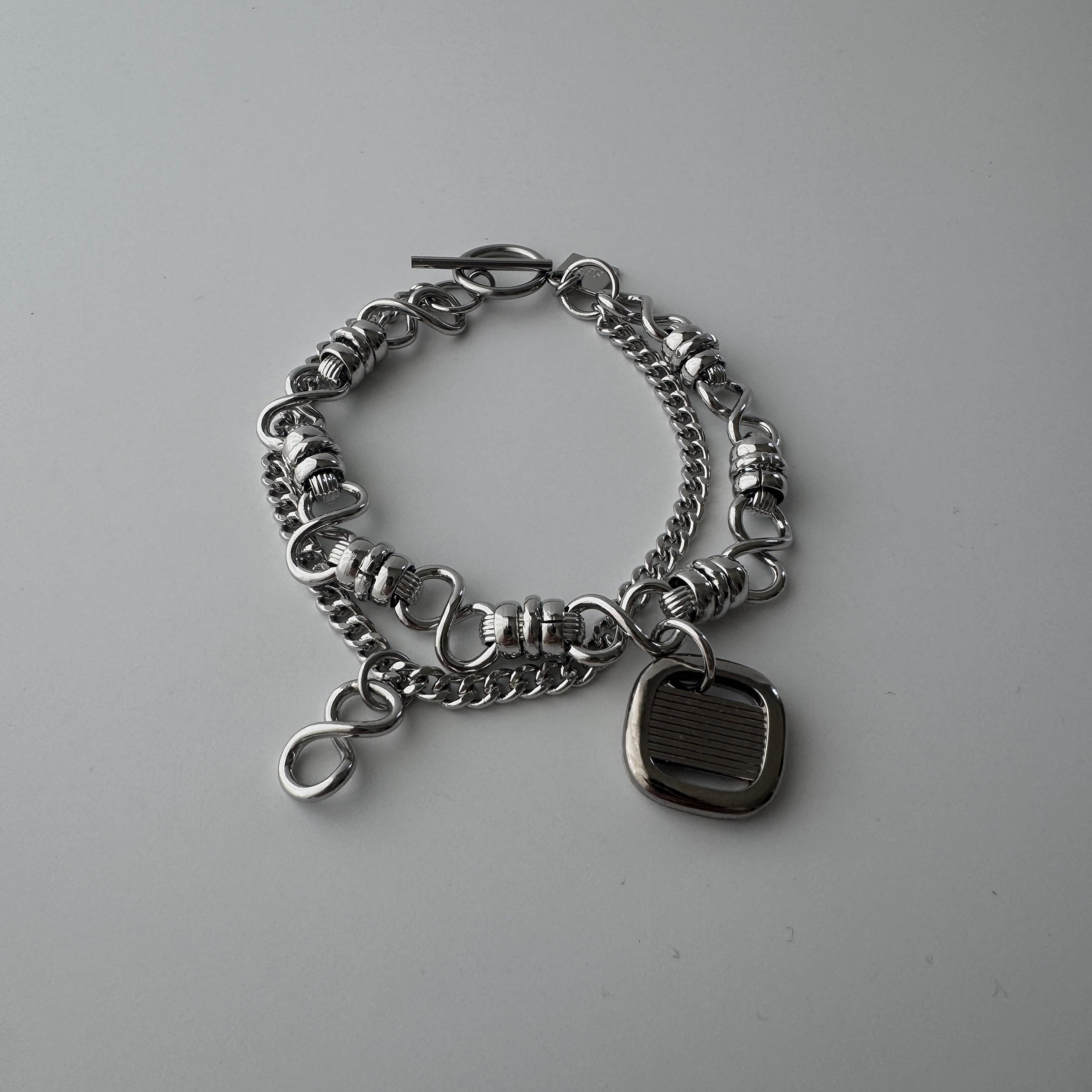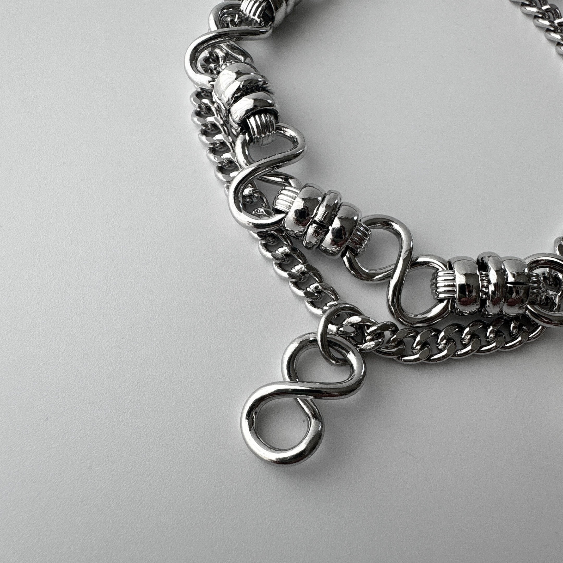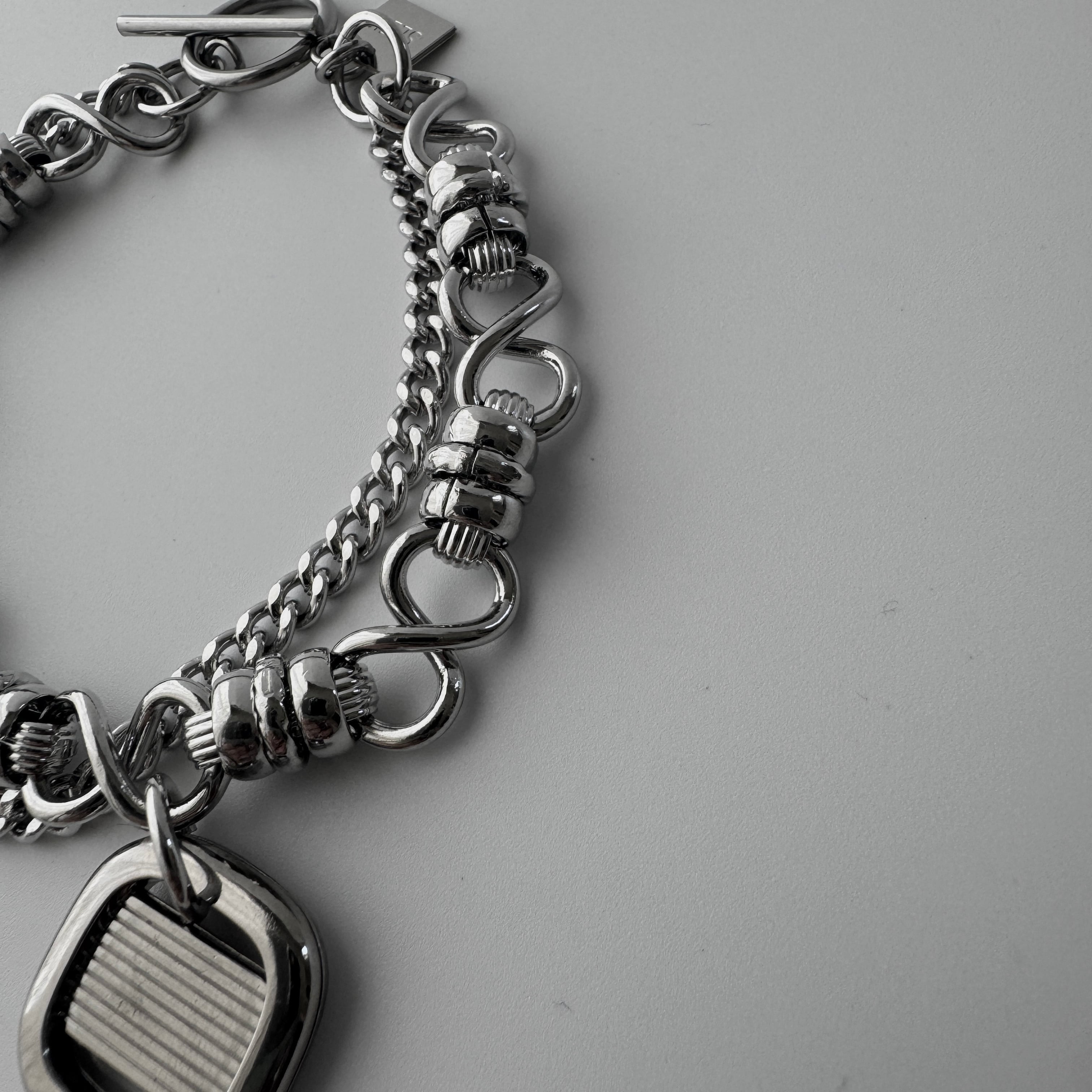 2本のチェーンにボタンを組み合わせることで、トップに固定せず、手の甲に軽く触れるような躍動感を演出しています