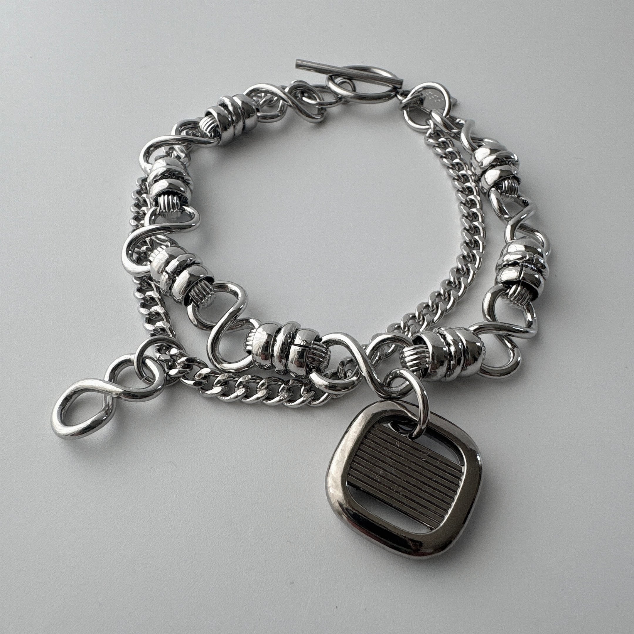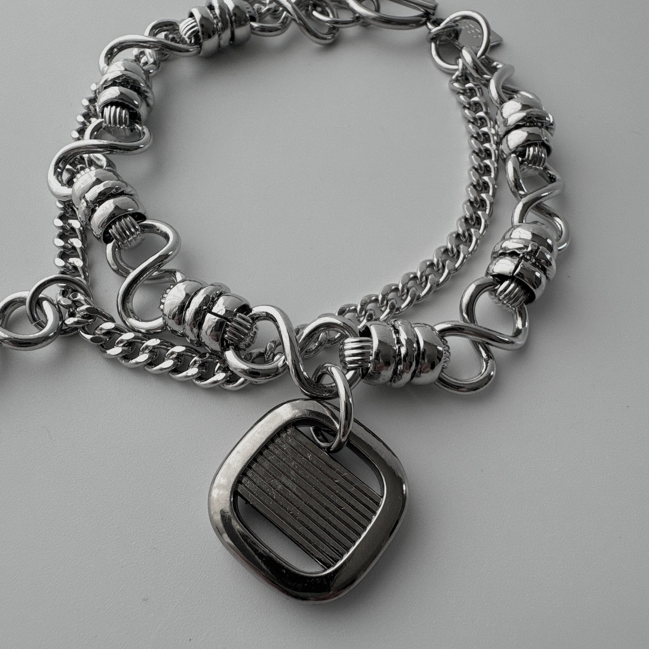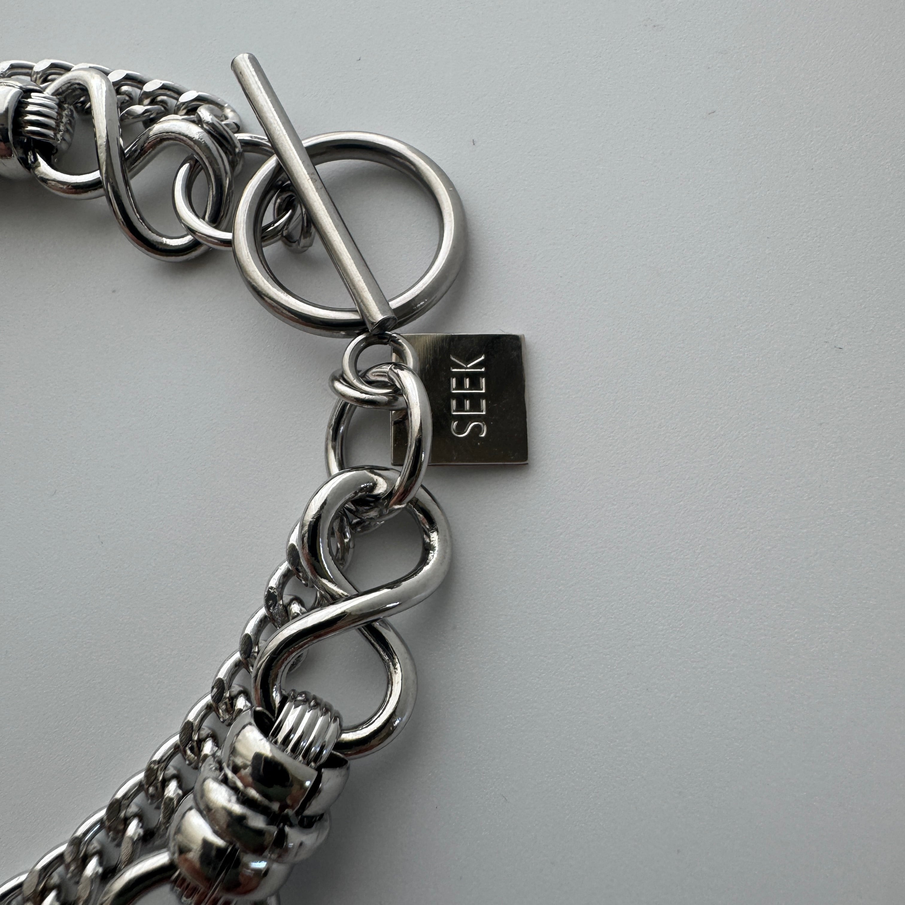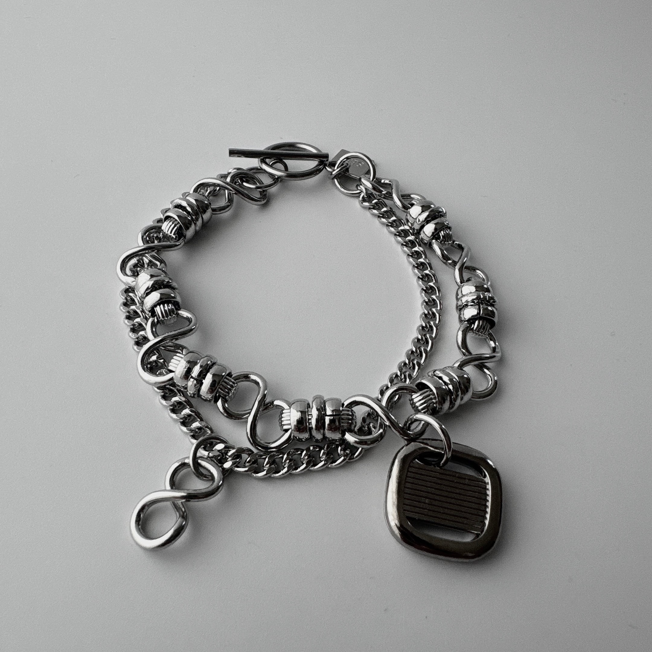 2本のチェーンにボタンを組み合わせることで、トップに固定せず、手の甲に軽く触れるような躍動感を演出しています
