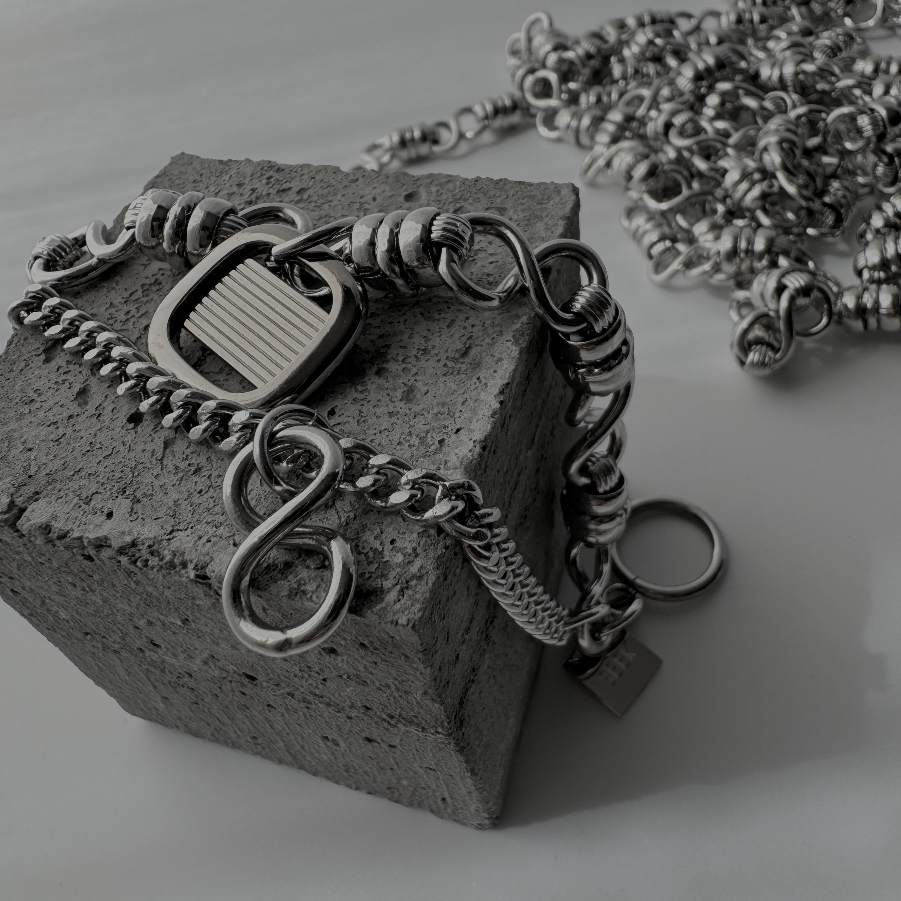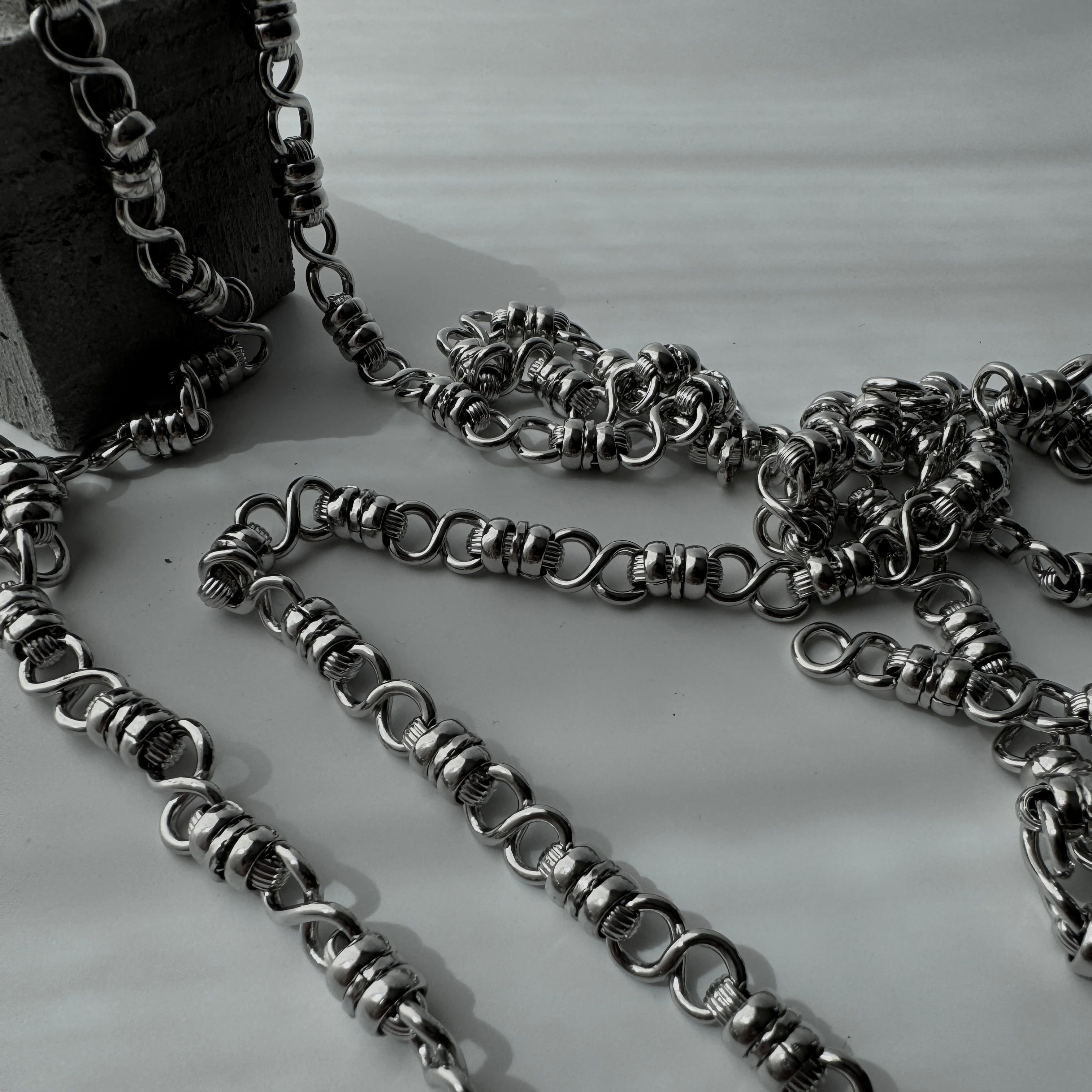 ボタンを繋ぐチェーンには独特な結びのデザインで単なる金具ではない立体感とリズムをプラス