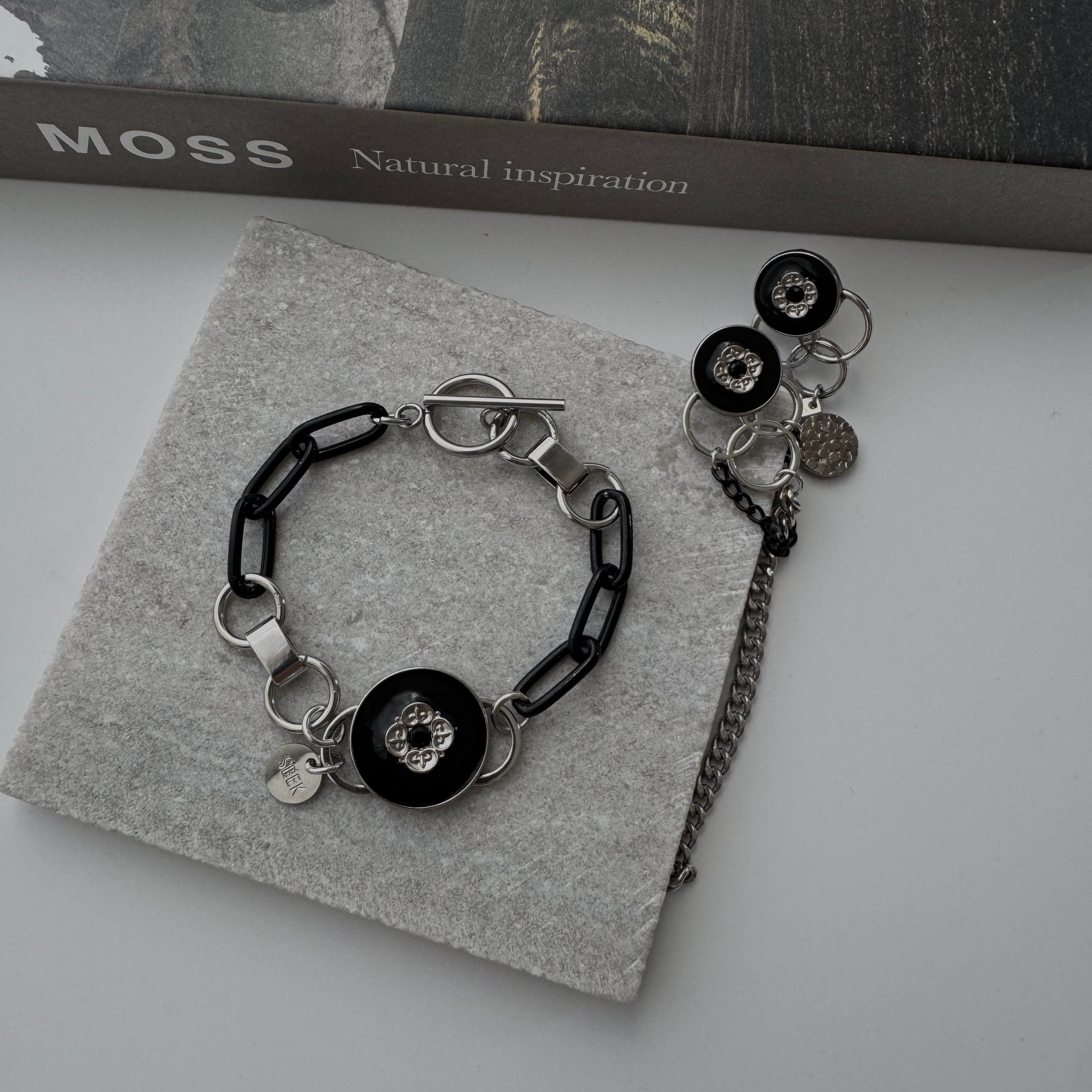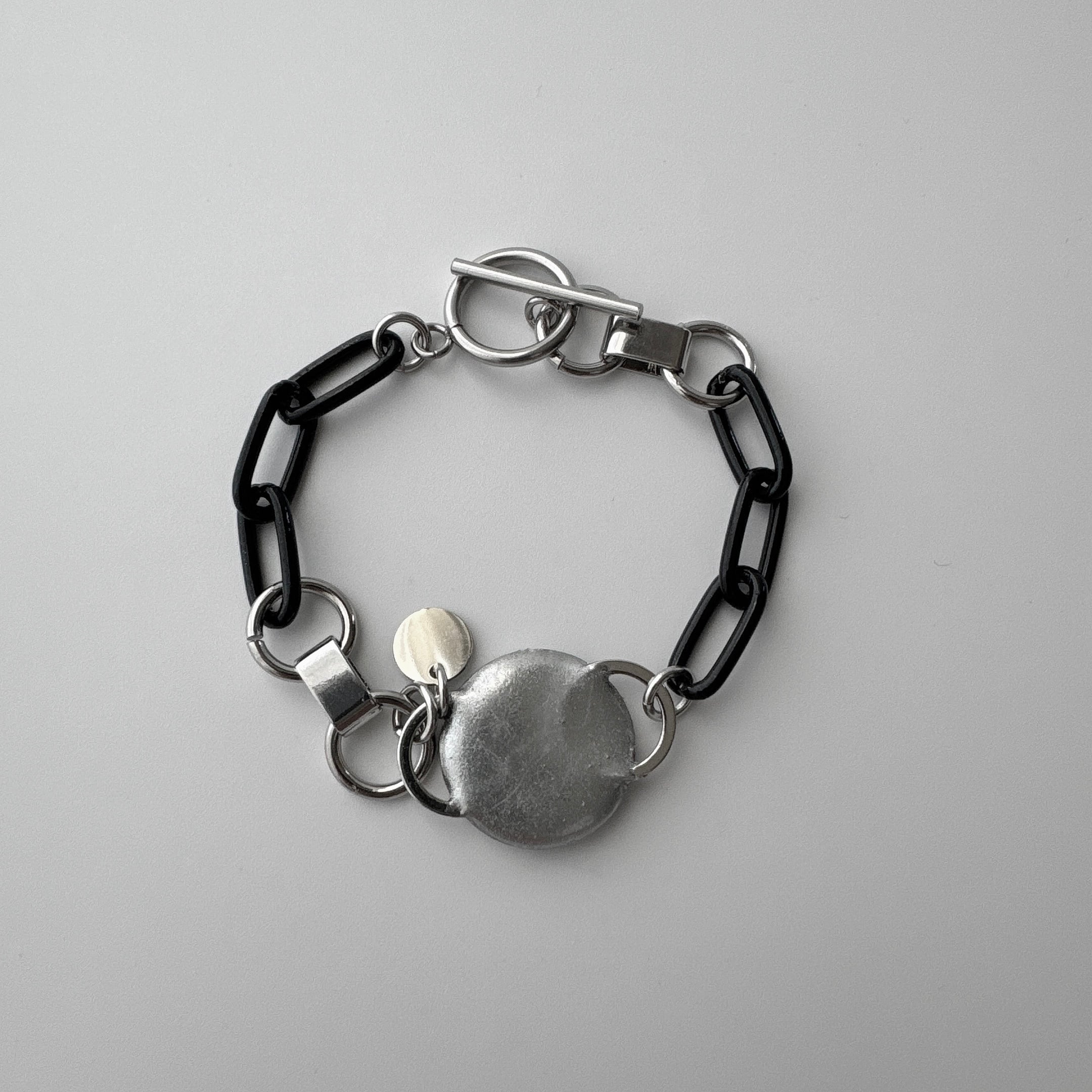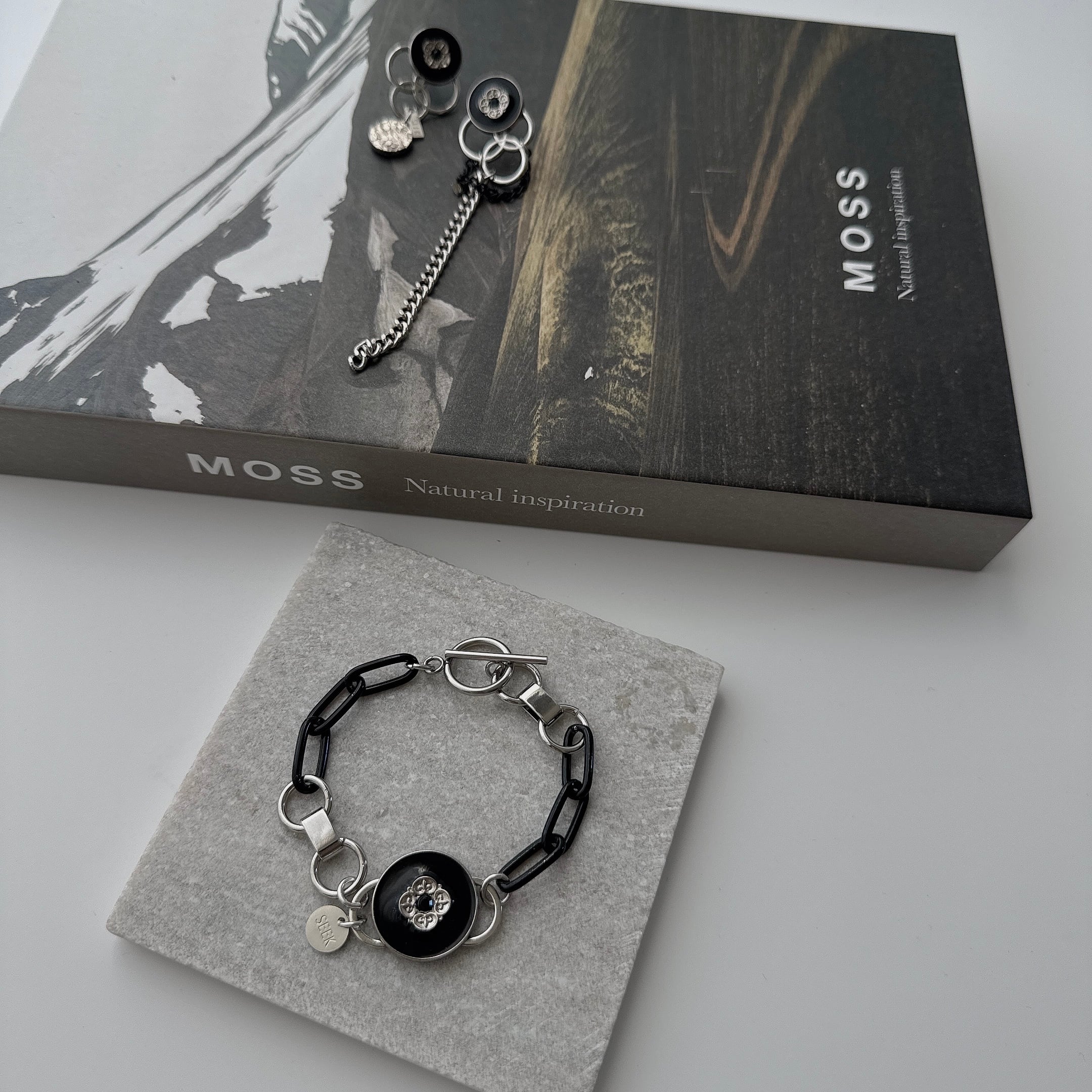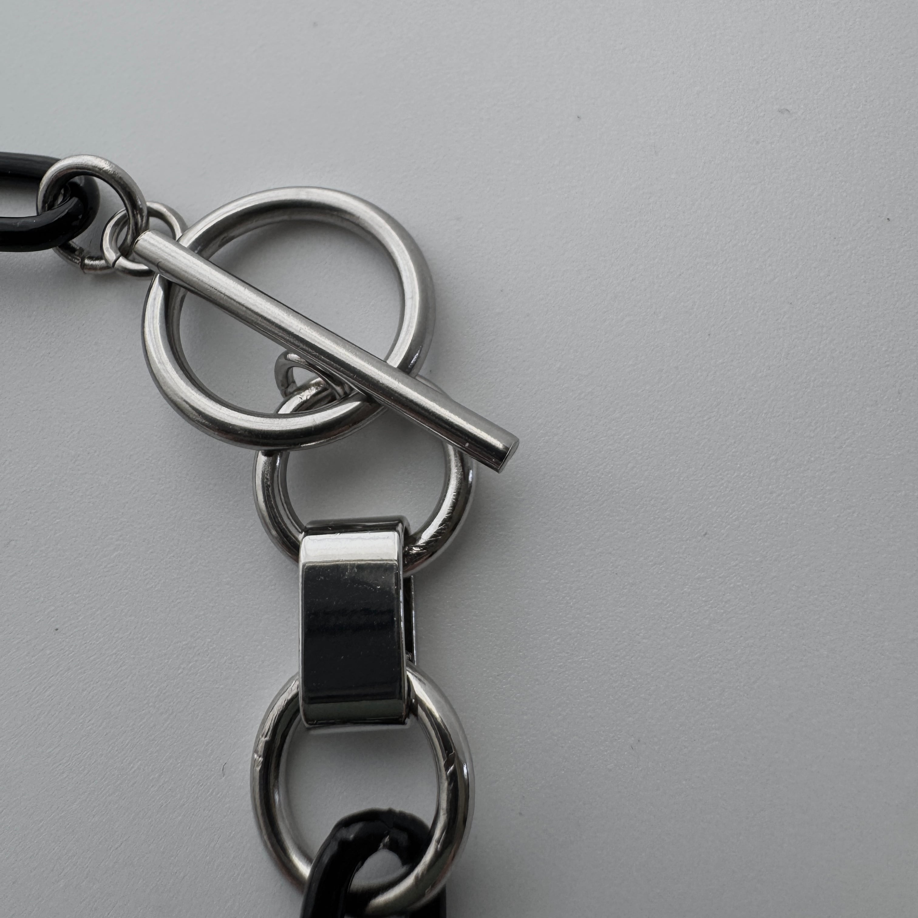 ボタンのシルバー×ブラックのコントラストを活かすため、あえてブラックチェーンを組み合わせ、ハードかつモードな雰囲気を引き立てています