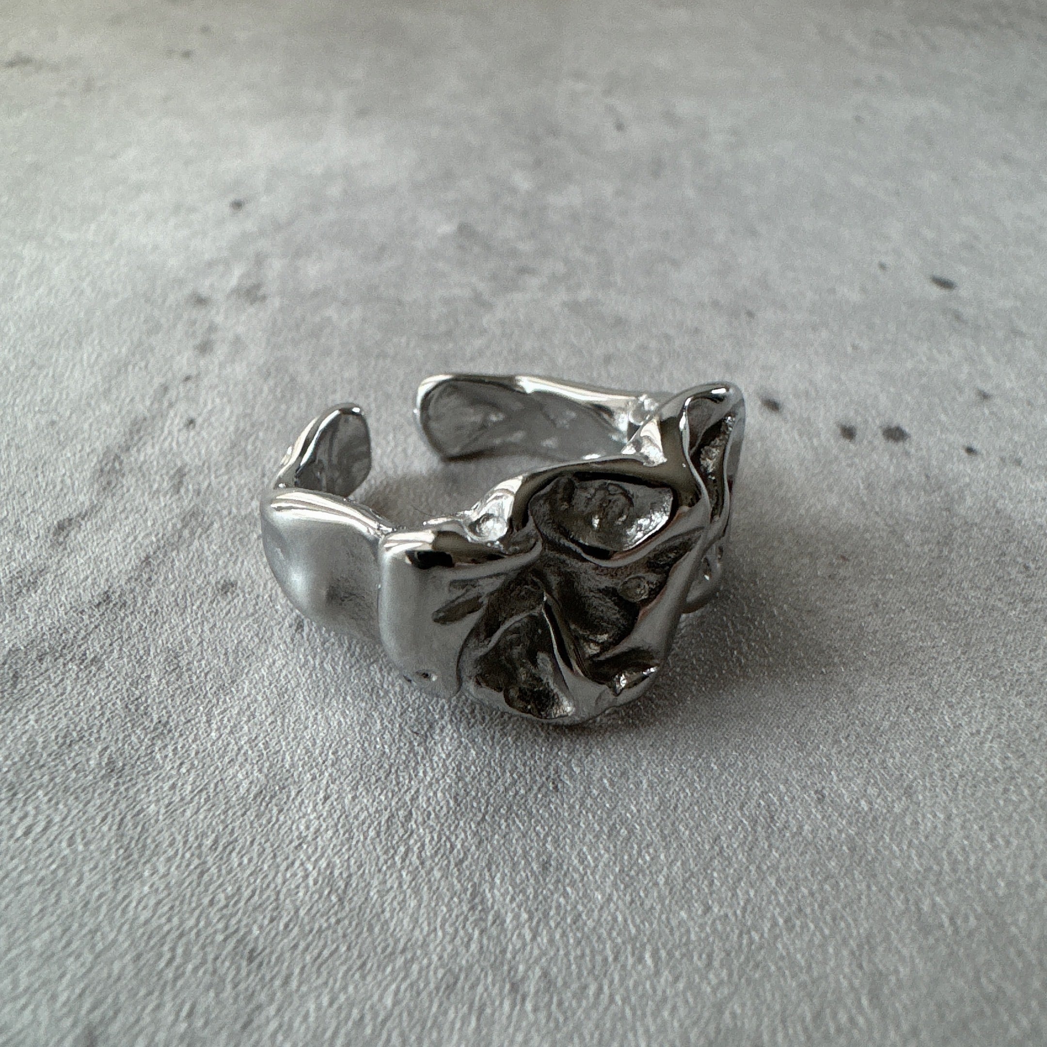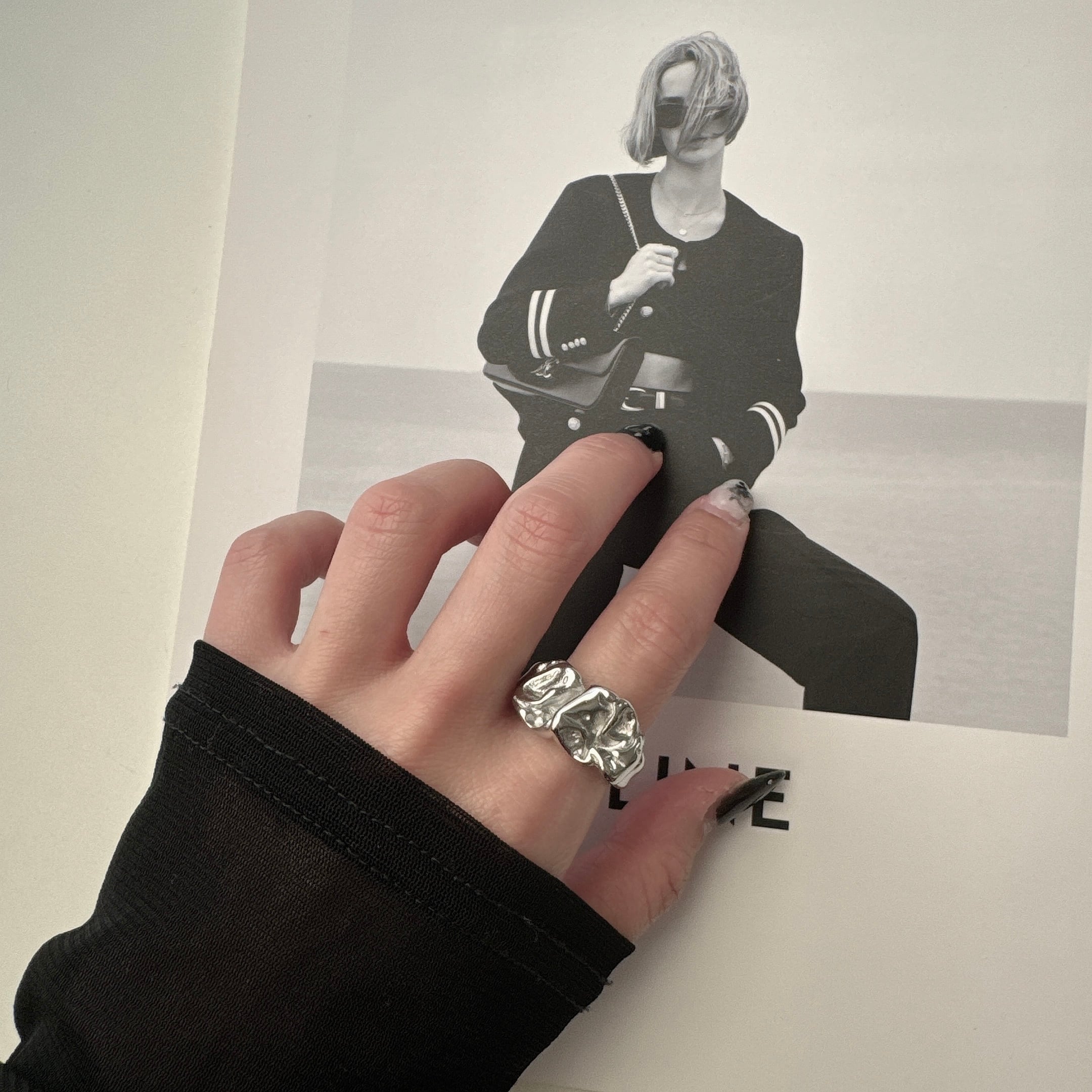 リング1つで存在感があるのでシンプルなコーディネートにひとつ加えるだけで、モードな印象へと引き締めてくれるデザインです