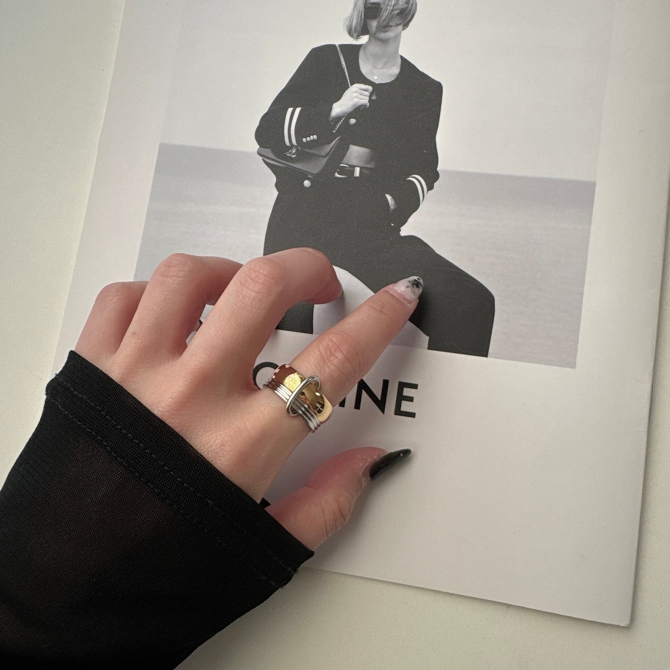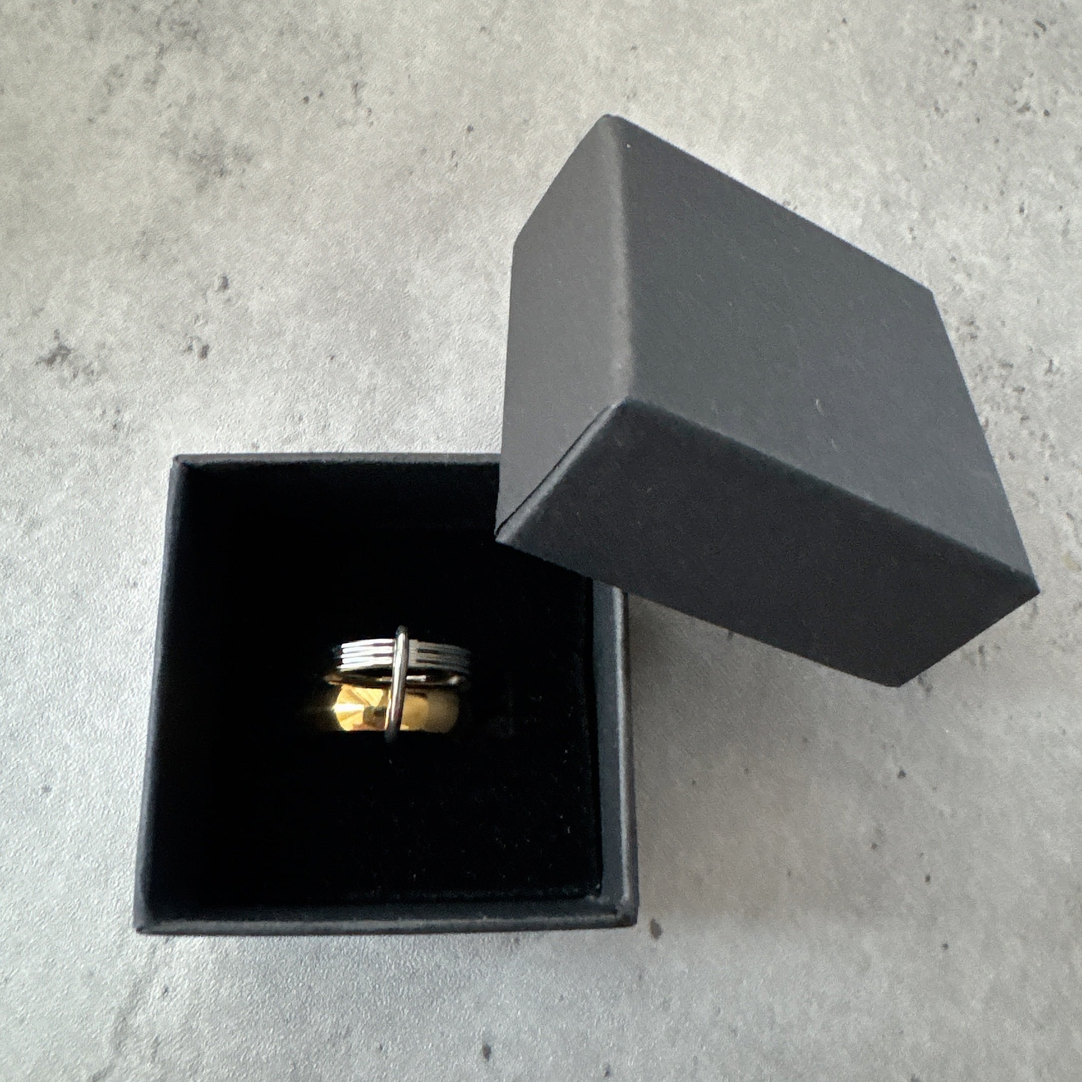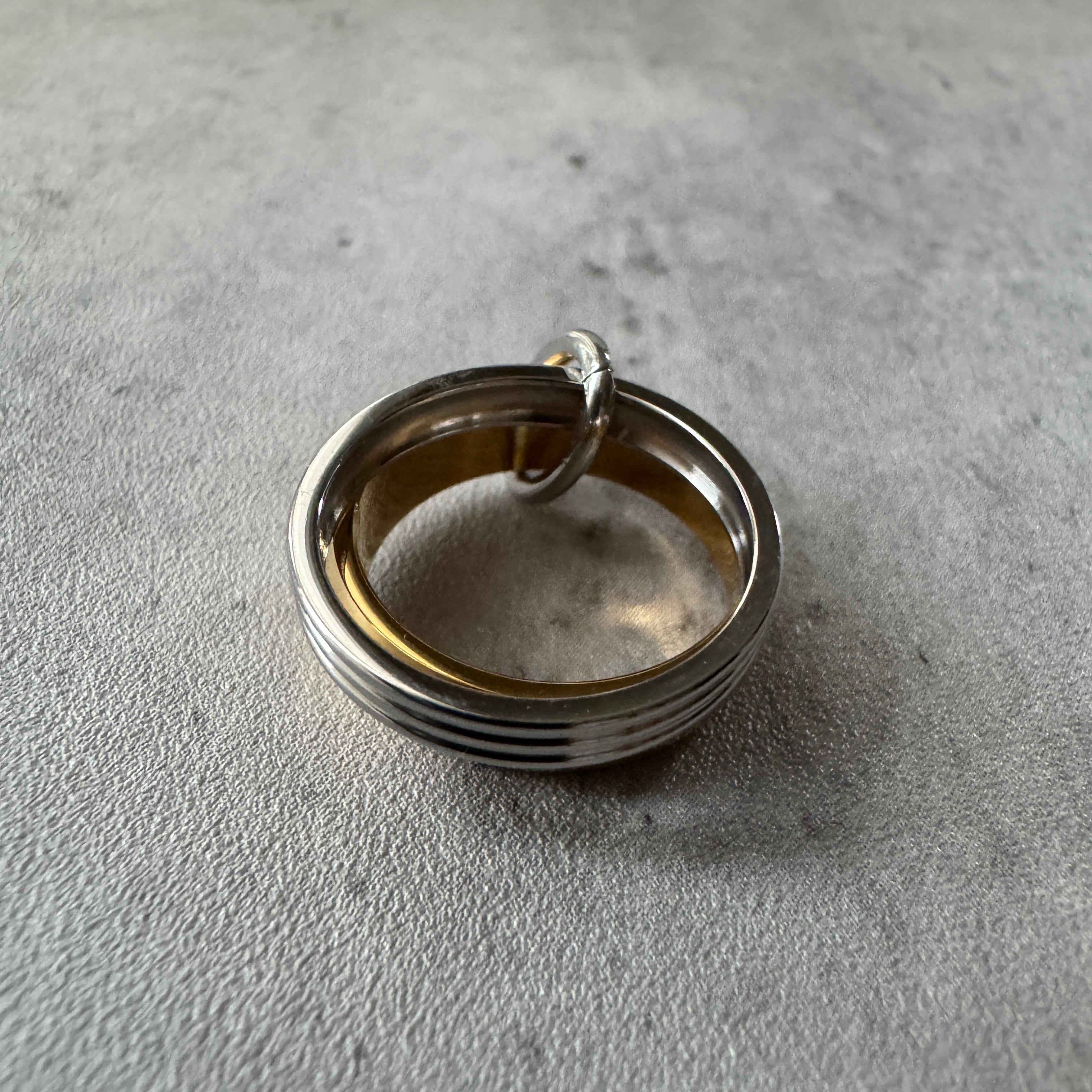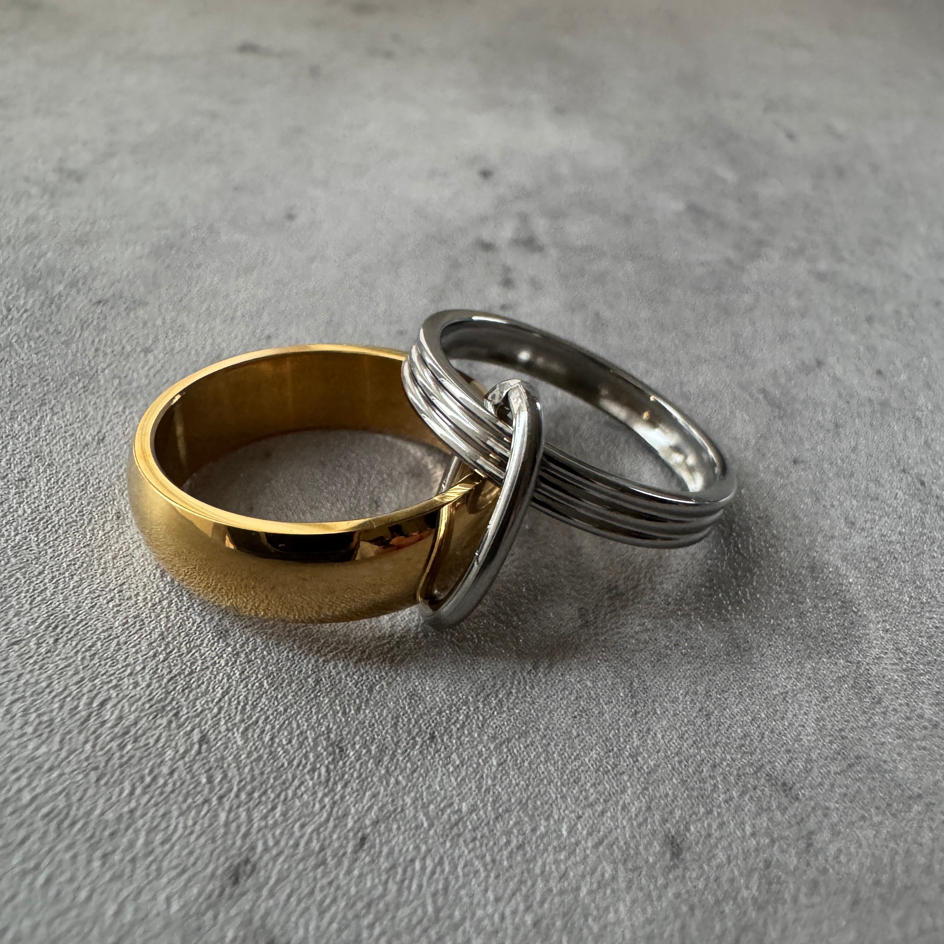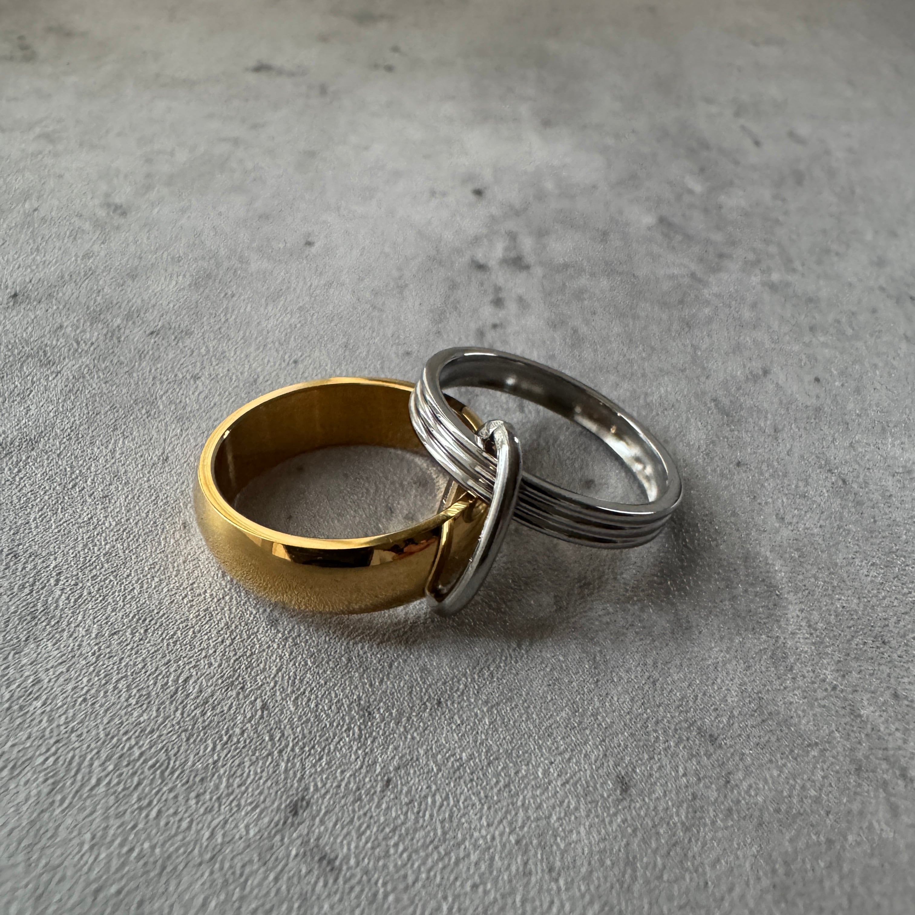 重なり合う二つのリングは、光の角度で表情を変えまるで“静と動”が共存するような存在感を放ちます