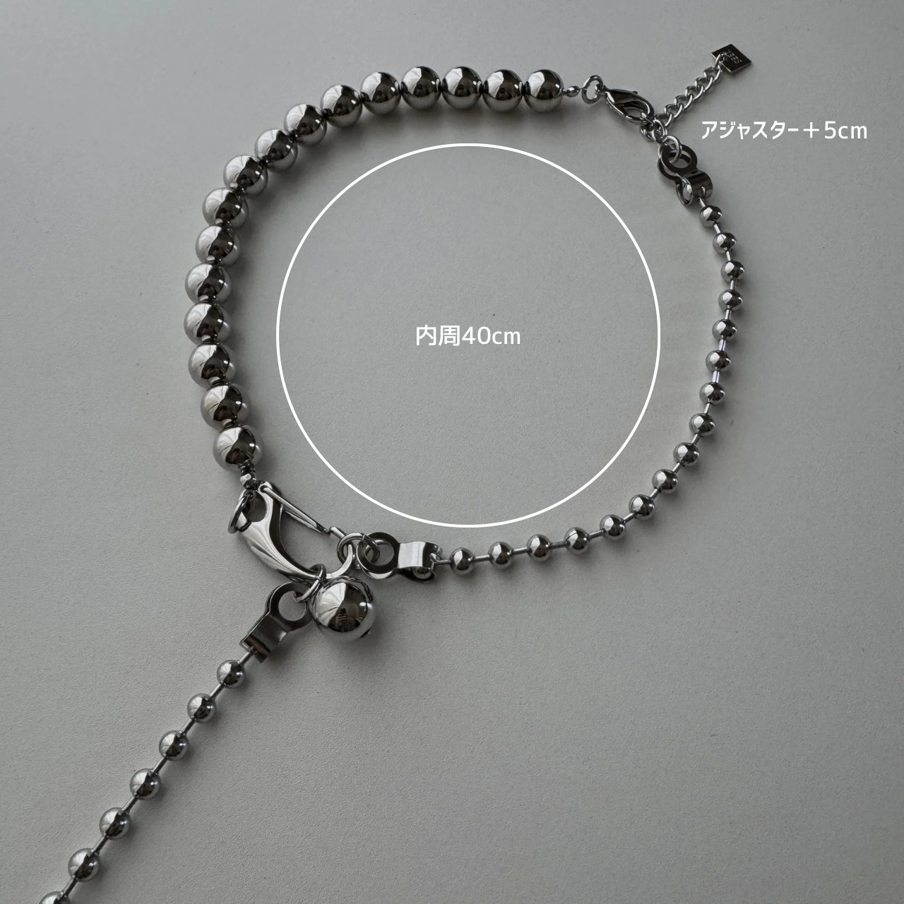 12mmのシルバービーズとボールチェーンをMIXし、アシンメトリーなバランスで仕上げた個性的なデザイン